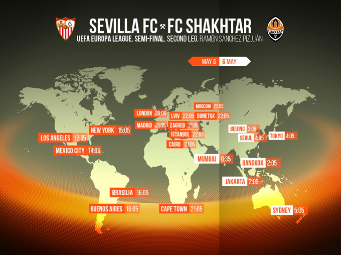 18:30.Бывший тренер «Шахтера» Николай Федоренко считает, что небольшое преимущество на стороне испанского клуба: «Понятное дело, что «горнякам» придется раскрываться на «Рамон Санчес Писхуане», большими силами идти вперед, словом, рисковать, чтобы забить - иначе не выйти в финал. Хозяева же будут стараться поймать соперника на контратаке, использовать его любую ошибку».18:15. Время начала поединка в разных городах мира:.jpg)