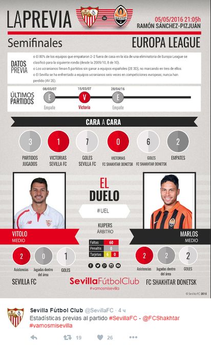 shakhtar.comСегодня состоится ответный матч 1/2 финала Лиги Европы «Севилья» - «Шахтер». Встреча пройдет в Севилье на стадионе «Рамон Санчес Писхуан». Начало в 22.05. Анонс поединка от Sport.ua здесь.