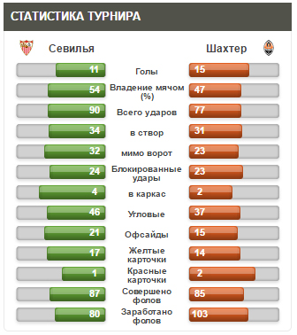 19:54. Статистика команд в нынешней Лиге Европы (напомним, обе провели по 7 игр в этом сезоне):.jpg) 19:39.Бывший футболист донецкого клуба Виктор Грачев уверен, что «горняки» обыграют «Севилью»: «Верю, что «Шахтер» должен выиграть. С каким счетом? Может быть, 2:1, а может и 3:2. Не сомневаюсь, что нас снова ждет результативная игра, – увидим не меньше трех-четырех голов. Ну а в финале Лиги Европы, как я уже говорил не раз, ожидаю противостояние «Ливерпуля» и «Шахтера».19:24.Экс-игрок «Днепра» Андрей Полунин рискнул спрогнозировать счет поединка «Шахтера» против «Севильи»: «Команда Мирчи Луческу уже показывала на примере «Шальке» (после домашней ничьей), что может выходить из незавидного положения. Тем более сейчас, когда находится на эмоциональном и психологическом подъеме после уверенной победы над «Динамо». Поэтому рискну предположить, что в Севилье «Шахтер» добьется победы со счетом 1:0».19:05. 3 часа до матча!