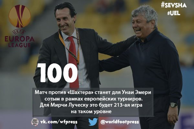 20:55. Стали известны стартовые составы команд.«Севилья»:Сория, Тремулинас, Карричо, Рами, Марьяно, Крыховяк, Нзонзи, Витоло, Банега, Коке, Гамейро.«Шахтер»:Пятов, Срна, Кучер, Ракицкий, Исмаили, Малышев, Степаненко, Коваленко, Марлос, Тайсон, Эдуардо.20:53. Если вы находитесь за пределами Украины, то здесь можно посмотреть список стран и телеканалов, которые будут транслировать полуфинал «Севилья» - «Шахтер».20:39.Экс-наставник донецкого «Шахтера» Валерий Яремченко порассуждал о шансах украинского клуба на выход в финал Лиги Европы: «Я скажу так: у «Шахтера» есть высокий шанс выйти в финал, хоть они и не являются фаворитами. Их главное преимущество в том, что Луческу проповедует такой стиль игры, который очень близок к испанской Ла Лиге. Им знаком этот футбол, в который играет «Севилья», что очень важно. За счет этого они могут победить, и я в это верю!».20:24. Мирча Луческу намного опытнее Унаи Эмери, для которого сегодняшний поединок - юбилейный:.jpg) 20:09.«Рамон Санчес Писхуан»: последние приготовления