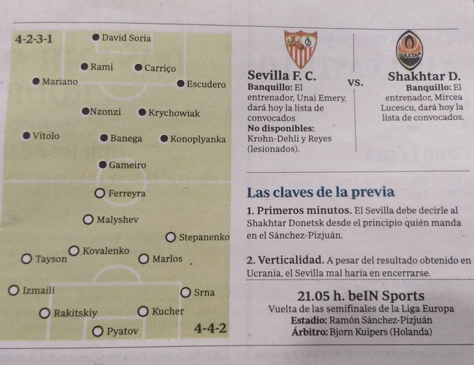 .jpg) 20:55. Стали известны стартовые составы команд.«Севилья»:Сория, Тремулинас, Карричо, Рами, Марьяно, Крыховяк, Нзонзи, Витоло, Банега, Коке, Гамейро.«Шахтер»:Пятов, Срна, Кучер, Ракицкий, Исмаили, Малышев, Степаненко, Коваленко, Марлос, Тайсон, Эдуардо.20:53. Если вы находитесь за пределами Украины, то здесь можно посмотреть список стран и телеканалов, которые будут транслировать полуфинал «Севилья» - «Шахтер».20:39.Экс-наставник донецкого «Шахтера» Валерий Яремченко порассуждал о шансах украинского клуба на выход в финал Лиги Европы: «Я скажу так: у «Шахтера» есть высокий шанс выйти в финал, хоть они и не являются фаворитами. Их главное преимущество в том, что Луческу проповедует такой стиль игры, который очень близок к испанской Ла Лиге. Им знаком этот футбол, в который играет «Севилья», что очень важно. За счет этого они могут победить, и я в это верю!».20:24. Мирча Луческу намного опытнее Унаи Эмери, для которого сегодняшний поединок - юбилейный: