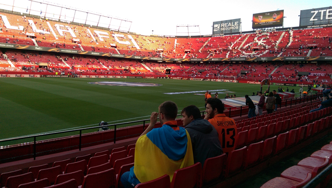 18:59. А вот как свои выездные матчи провел украинский клуб в нынешнем розыгрыше Лиги Европы:.jpg) 18:43. В Севилье вовсю чувствуется приближение матча. И это несмотря на то,зарядил проливной дождь. Капало с утра, но сейчас льет как из ведра.Возле стадиона «Хуан Санчес Писхуан» есть большой торговый центр и множество ресторанчиков и кафе. Фаны испанской команды от дождя прячутся там, потягивая вино и пиво.